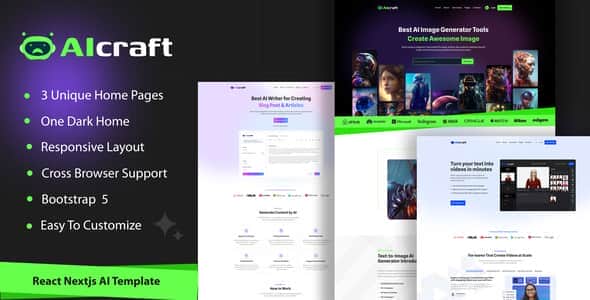 AIcraft is a AI Application & Generator React Next js and Bootstrap template designed specifically for AI Content Generator, AI Video Generator, AI Video Generator. This meticulously designed multi-purpose website caters specifically to AI content and video generators, offering a minimalist, elegant, and user-friendly experience.