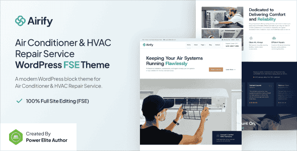 Introducing Airify, a WordPress theme designed for Air Conditioners, HVAC Repair & Maintenance Services, Handyman, Ventilation, Air Conditioning, and other Home Care Services. Fully compatible with the WordPress Block Editor and powered by the Gutenverse plugin, this theme offers a professional design with a 100% responsive layout and is easy to customize, so no coding is required.