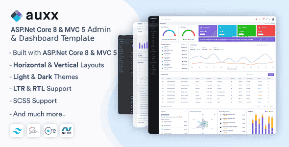 Auxx is a versatile and user-friendly Tailwind CSS admin and dashboard template built with ASP.NET CORE 8 AND MVC 5. It boasts full responsiveness, extensive customization options, and a rich selection of pre-designed components, pages, and layouts to streamline the creation of stunning and functional dashboards for your projects. Whether you are building a web app, dashboards, admin panels, eCommerce platform, HR system, social network, email client, analytics dashboard, or any SASS-based interface, Auxx’s admin dashboard template is your ideal choice.