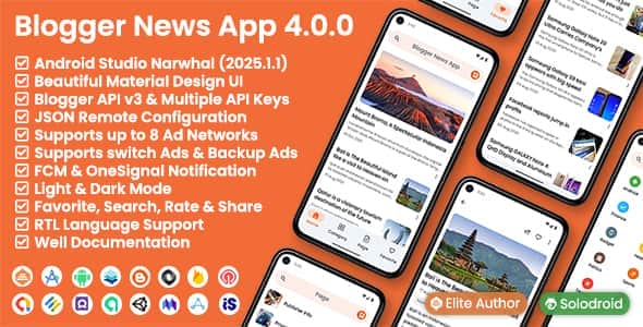 Blogger News App is Android app template to displaying posts or articles from Blogger Site. It loads all Blogger posts, labels, pages and shows in a beautiful and well designed layout. Run under Android platform and built using Android Studio with Java Programming Language so make the app run natively, fast and smooth. Implement Google Material Design UI make the app beautiful in design and user experiences.