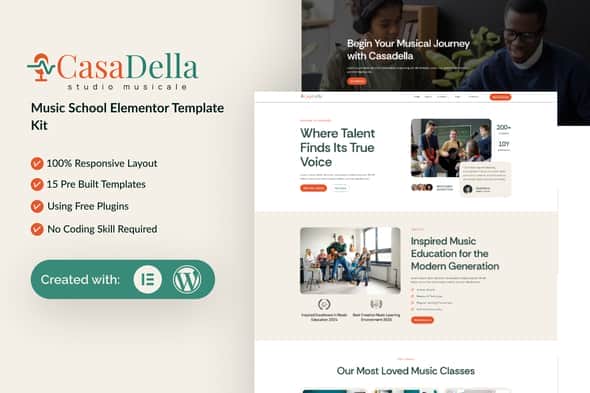 CasaDella is a professional, modern and clean Elementor Template Kit designed for Music School, Music Course & Academy, Vocal School, Music Teacher, or Music Studio website. It is also perfect for individual potter and handmade shop. Built for WordPress, it seamlessly integrates with Elementor, enabling you to craft a professional website effortlessly—no coding skills required.