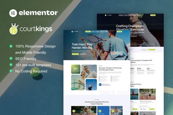 CourtKings is Elementor Template Kit for tennis school & Sport Club website. It has 12+ pre-built templates with clean style, modern and professional layout design. Suitable for any website related to tennis school & tennis course. This template kits also has blog layout design, so you can use it for blogging everything about tennis. You can also use this sport template kit for any kind of business or services related to tennis club website such as tennis academy, tennis course, tennis club, tennis school, even you can use this layout it for any sport club website.