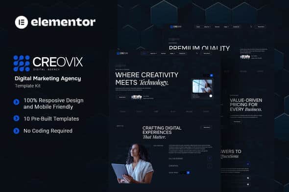 Creovix is a modern and professional Elementor Template Kit designed for digital agency and creative service websites. Perfect for digital strategists, branding specialists, and web development professionals, this kit helps you showcase your portfolio with impact, highlight your expertise, and guide clients through every step of building a powerful online presence. With its clean design and intuitive layout, Creovix ensures your brand reflects innovation, reliability, and a commitment to delivering exceptional digital solutions that drive growth and success. Creovix uses free elements, so don’t worry about trying this one. Creovix provides various pages including Home, About Us, Team, Services, Pricing, Project, FAQs, Blog, 404, Contact Us.