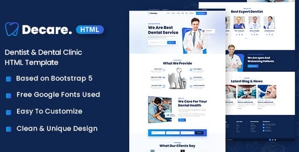 Decare – Dentist & Dental Clinic HTML Template.you can create a website for Dental Clinic, Dentist and Dental Care. Created for all sorts of dental clinics and other doctors, dental care, personal dental practice, cosmetic dentistry services, medical clinics with other dentist services, etc..
