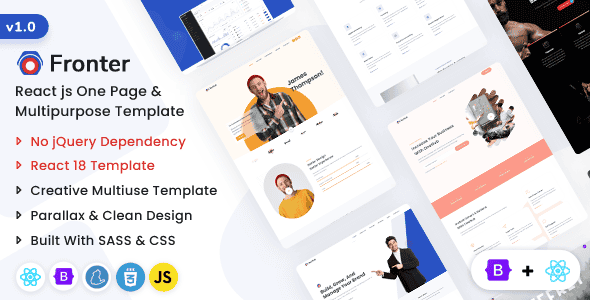 Fronter is a Powerful One Page and Multipurpose React Template. It is a Fully Responsive Template suitable for any creative or business startup. Multiple navigation styles are included in this template. A perfect template for business startups, Gym, Restaurants, Personal, photographers, Web studios, and Creative agencies. The standard information sections will help anyone to customize according to their company info, and add blogs or works. Fronter is built with the React 18.x and Bootstrap v5.x.. It is 100% responsive and looks stunning on all screens and devices. Users will love your site because it gives them a unique user experience (UX), a clean, modern & beautiful design. They are also easy to customize and combine with other components.