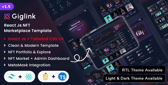 Giglink is a Powerful React Js NFT marketplace template. Giglink is a fully responsive, pixel-perfect, and complete template for NFTs, crypto-collectibles, digital items, non-fungible tokens websites, MetaMask Integration, and more. Giglink has a lot of styles and elements to help you make a beautiful and modern website in no time. It is a beautifully handcrafted, pixel-perfect landing page template based on React Js v19.x and the latest Tailwind CSS v4.1.13. Giglink offers various personalization options to help you give the look you require on your website. It is very easy to customize, and navigate and fits various screen sizes. We have added separate Javascript & Typescript versions RTL & Dark version Available: We have added the RTL version in both dark and Light versions.