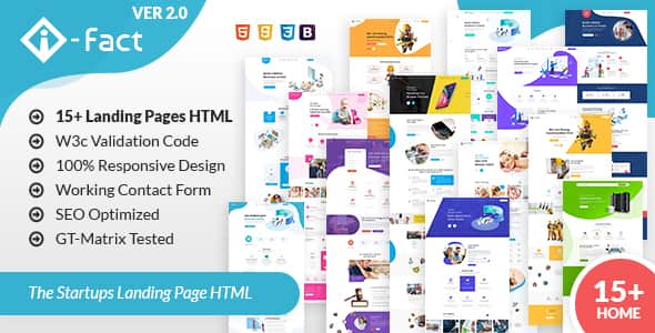i-Fact – Landing Page Template. 15+ Stunning Homepages are included in this template. We have done a research and find out what an app landing and a responsive website needs both on business & marketing section. So, we build a collection of practical multipurpose pages for you, then, it takes no time to set-up and gets i-Fact’s look on your own site.