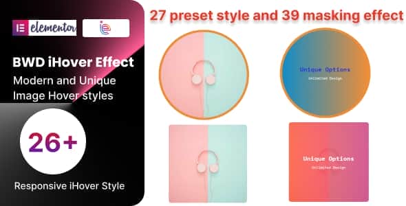 - iHover effect – BWD iHover Effect Addon is a lightweight Elementor Base WordPress plugin that helps you to add an iHover effect. There are 27 different preset designs for you to choose from style box and 39 masking styles.