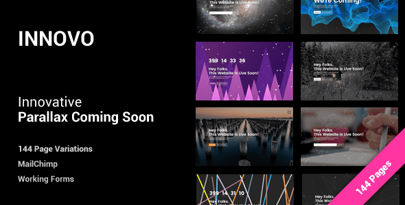Innovo is innovative and creative coming soon template with for every creative person, agency, e-commerce, portfolio etc. It brings 16 different pages in 3 variants – Parallax variant, Static text and Parallax background and Default version. Each in 3 version – Count down, Subscribe input form and Simple text. So it’s 144 pages!. Innovo is ready for MailChimp forms and has working contact and input forms..
