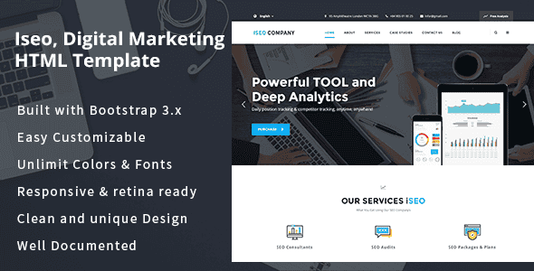 iSeo is a premium HTML Template with its design particularly regards to Seo, Makerting, Website – Design companies as well as it enables you to build a wide variety of business websites.