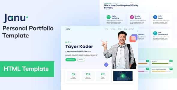 Janu – Personal Portfolio HTML Template fresh and clean Design. You can use this portfolio template for: agency, personal portfolio, architect agency, photography studios, sound and music, musician, painter portfolio, artworks, art, artist portfolio, web design works, illustrators, trainer, projects, freelance designer. Just take the best Template of your choice, change the text, add your images and done! we have a strong support team which 24/7 days available to support you.