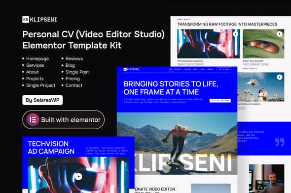 KlipSeni is a modern Elementor Template Kit that perfect to create a WordPress-based website for Personal CV, CV/Resume specialy for Video Editor Studio Personal CV. This template has a professional design with a 100% responsive layout, is retina-ready, and is very easy to customize because using Elementor so you don’t need a single line of coding!