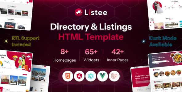 Available frameworks: Listee ships in HTML, Angular, React, Vue, and Laravel variants — giving developers flexibility to integrate with the backend of their choice.