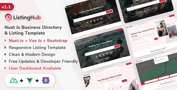ListingHub is the best business directory & listings template built on Nuxt 3, Vue 3 & Bootstrap 5 with more features and developer-friendly. It is supported on all modern & old browsers, tablets, and mobile devices. ListingHub is a high-quality and well-organized Nuxt template specially designed to fit all the needs of a Local Business Directory, Business review, Online business directory, City Listing, Restaurants Listing, Entertainment, Car/Motor Listing, Local Listing, or any other Business Directory Services.