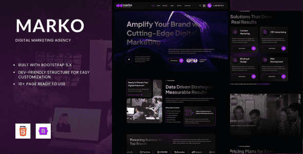 Marko is modern and elegant HTML5 Template for digital marketing agency. You can also use this creative template for any kind of business and services related to digital marketing, seo content, search ranking, onpage seo, offpage seo, keyword strategy, seo tools, content strategy, link building, seo copywriting, website traffic, google ranking, technical seo, content writing, digital visibility and all other digital marketing agency websites. etc.. This template is built using HTML5, CSS3, JavaScript, and is supported by frameworks such as Bootstrap to provide a modern and responsive look.
