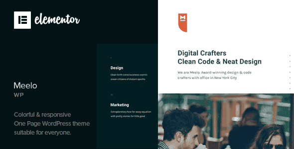 Meelo is corporate multipurpose one page WordPress theme which comes with a lot of premade sections (Home, Services, Portfolio, Clients, News, Skills, Team, Milestones, About, Pricing, Contact) which are included in one big scrolling page. The content is created using Elementor page builder, so it is very easy to change content in just few clicks.