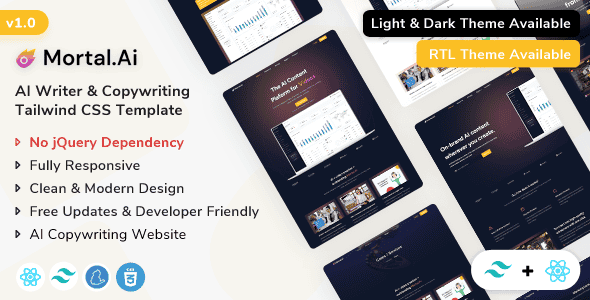 Mortal.Ai is a responsive React Js template for AI writers and copywriting websites. We have designed this template for your new AI Content Writing website just how you like it. So, if you want to create a website for Writing Blog Content, Digital Ad Copy, Technical Writing, SEO Content, Landing Page Copy, Social Media content, Email Marketing, Website Copy, Marketing Copy, e-commerce Copy, Product Description, and Email Marketing then Mortal.Ai Reactjs + Tailwind CSS template will best choice to build your own website. It is 100% responsive and looks stunning on all types of screens and devices. Users will love your site because it gives them a unique user experience (UX), and a clean, modern & beautiful design. They are also easy to customize and combine with other components.