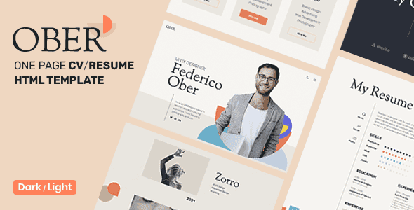 Ober – CV Resume HTML5 Template is best suited for developer, designer, programmer, freelancer, writer, lawyer, musician, trainer, photographer or any other professions. OBER is comes with: Dark & Light versions, Live Switcher Mode, One & Multi pages, Beautiful animations, Parallax, Awesome Portfolio with Filters. Perfectly for placing information about your experience, skills, education, works and expertise. Ideal for any type of profession as for creative cv and personal website. Creating a Resume/CV or personal website with OBER is an effective way to promote yourself and showcase your works.