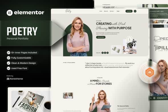 Poetry is a sleek, modern Elementor Template Kit specially designed for portfolio, professional, cv, resume, studio, agency and freelancers. With clean layouts, responsive design, and high-converting sections, Poetry helps you launch a professional website quickly — without needing Elementor PRO or a heavy WordPress theme.