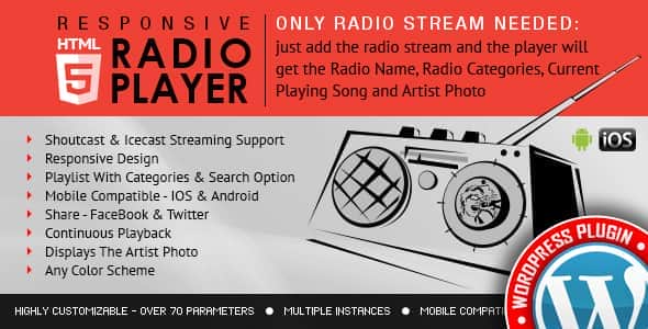 Keywords: html5, wordpress, radio, audio, mp3, music, player, playlist, ios, song, mobile, streaming, playlist, search, Shoutcast, Icecast, audioplayer