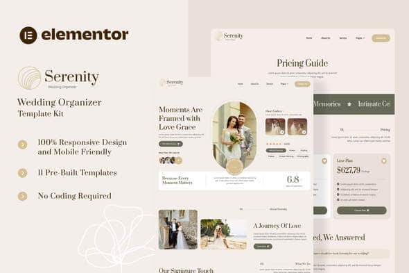 Serenity is an Elementor Template Kit designed for wedding organizers and celebration planners. It’s perfect for event stylists, wedding coordinators, and businesses seeking to craft unforgettable moments with elegance and grace. Serenity is built using free elements, making it accessible and easy to customize for any user. Serenity provides various pages including Home, About Us, Service, Team, Pricing, Project, FAQ’s, Testimonial, Blog, 404, Contact Us.