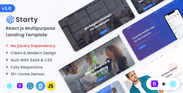 Starty is a Powerful, Responsive Multi-Purpose Multi-Page & One-Page React Template. Starty is perfect for Startup Business, Corporate Business, Finance, Application, Saas, SEO Agency, Digital Marketing, Marketing, Product Launch, Restaurant, Coffee and Cafe, Personal, Minimal Portfolio, Developer, Personal Blog, Charity, Event Management, e-Commerce and any type of other businesses. Starty is built with the React 18.x and Bootstrap v5.x. You can quickly get started your project using 18+ stunning and unique niche home page demos. You can showcase your dream portfolio using 20+ awesome portfolio styles and have everything for a great portfolio. Works pretty fast and it is smartly responsive on all devices, it looks amazing on PC, Tablets, Smartphones, etc. Your visitors will be able to experience brilliant optimized same design in different screen types and devices. Dark version Available: We have added a Dark & Light Theme