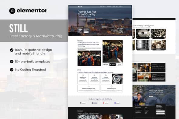 Still isa professional and modern Elementor Template Kit for factory and industrial manufacturing websites built in WordPress. You can also use this creative template kit for any kind of business or services related to steel factory and industrial plant manufacturing website such as manufacturing plants, developing factories, engineering bureaus, or construction companies and industrial business firm websites.