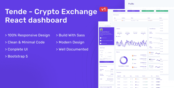 Tende is the complete Cryptocurrency Exchange React Admin Template with Dashboard, Trade, Wallet, Profile, Settings, Signin, Signup, Reset, OTP number, OTP Code pages included.