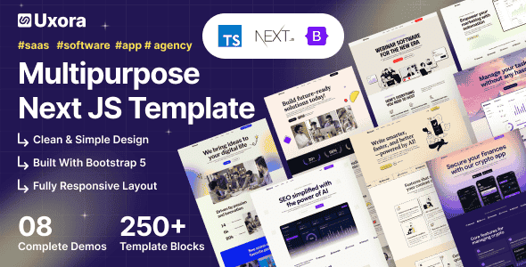 Uxora – Sass And software Next js Template designed Next js template ideal for showcasing Software Solutions. Built with Bootstrap Framework 5, SssS and CSS3. It offers a clean, user-friendly layout emphasizing your expertise and services, providing visitors with an exceptional online experience.