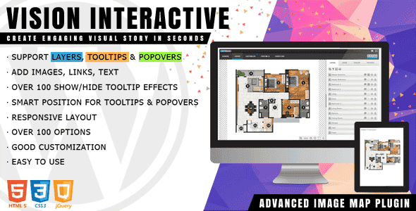 Vision Interactive is a lightweight and rich-feature plugin helps you enhance images with additional information and links. With this plugin you can easily annotate images with text, shapes, icons, draw attention to areas and features on images. You can then use them in posts that empower publishers and bloggers to create more engaging content. It provides an easy way for you to convert a static image into the online interactive media brochures or booklets, image maps, floor plans, family tree, immersive storytelling in seconds. The plugin can be deployed easily and runs on all modern browsers and mobile devices.