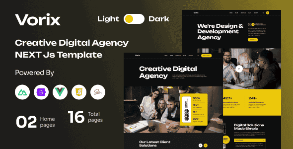 Vorix is a versatile and dynamic Nuxt template designed for Creative and Digital Agencies. It includes over 15+ high-quality pages, such as two stunning home pages, service pages, portfolio pages, team pages, testimonials, blog layouts, and more. Ideal for any creative agency, this template is crafted for easy customization, offering a professional and visually appealing solution for your online presence. Based on the robust Bootstrap 5 grid, Vorix is perfectly suited for creative professionals, businesses, or personal websites.