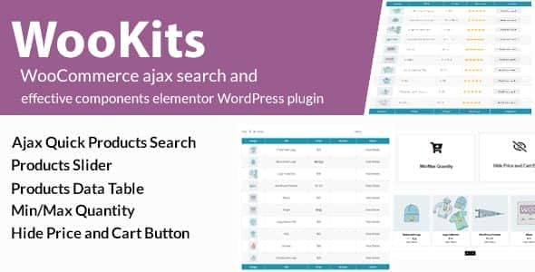 Wookits – WooCommerce Ajax Search and effective components Elementor WordPress plugin. This plugin helps you to add a quick ajax product search, product slider, product data table, Min/Max product Quantity, price and add to cart button hide option.