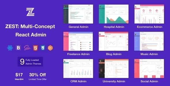 Zest: React Admin has the power of multiple admin themes in one. There are total 9 different admin themes integrated in this one project. They are General Admin, Hospital Admin, University Admin, Music Admin, CRM Admin, Freelance Admin, Blog Admin, Ecommerce Admin, Social Media Admin. Below is the demo link for each admin:
